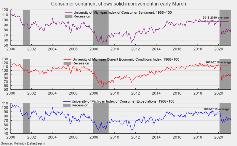 The preliminary March results from the University of Michigan Surveys of Consumers show overall consumer sentiment rose in early March, hitting the highest level in a year. Ongoing distribution of vaccines as well as expectations for stimulus were the primary drivers.