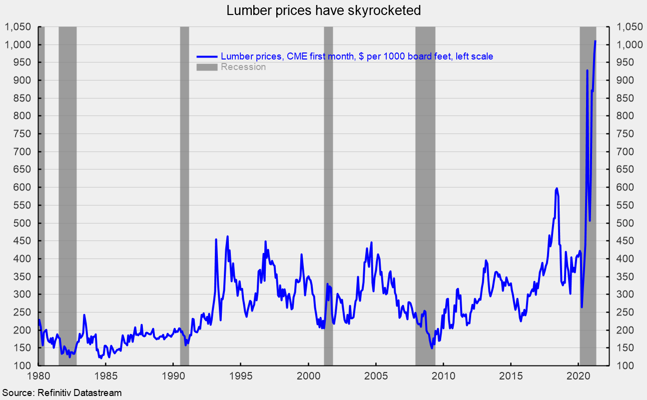Furthermore, the surge in demand and activity has sent lumber prices soaring (see fourth chart). The increase in lumber prices is pressuring profit margins for homebuilders.