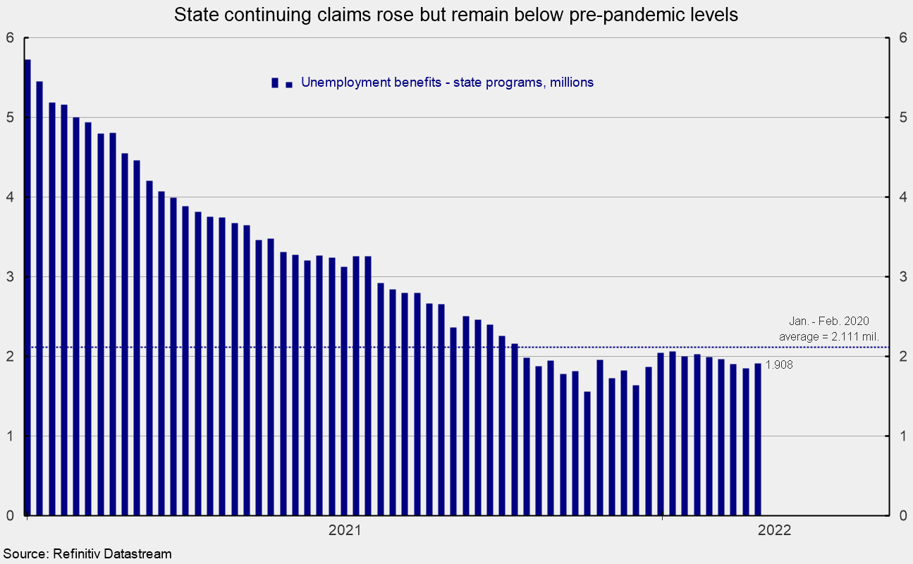 The number of ongoing claims for state unemployment programs totaled 1.908 million for the week ending February 26, a rise of 59,752 from the prior week (see second chart). State continuing claims have declined in five of the past seven weeks and remain below their pre-pandemic level of 2.111 million (see second chart).