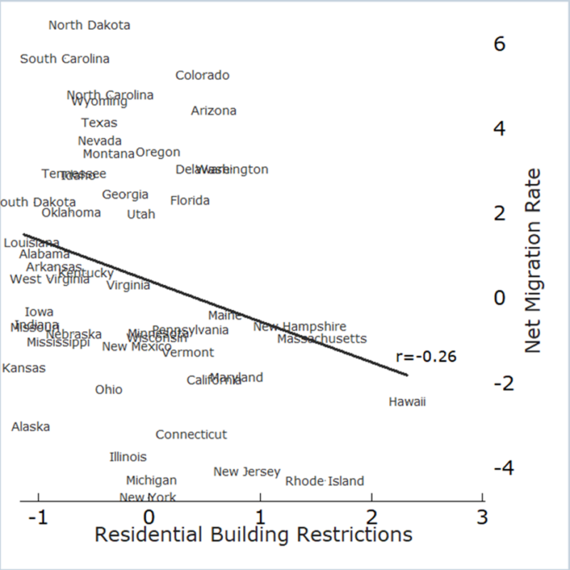 And that’s exactly what we do see. Figure 5 shows the relationship between zoning stringency and net migration rates at the state level. States with stricter zoning are losing people to states with looser zoning. This chart likely understates the negative causal effect of zoning on net migration, since states with historically high migration were more likely to tighten zoning in the first place.