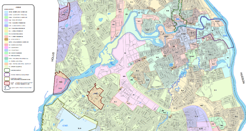 The zoning districts in the columns of Figure 1 are plotted on a zoning map. Figure 2 displays a portion of the zoning map for Nashua. There are two types of zoning districts on this map: base districts and overlays. Base districts correspond to the regulations that apply outside an overlay. An overlay district modifies the regulations in the base district in certain respects (but not others). These modifications could make the regulations stricter or less strict.