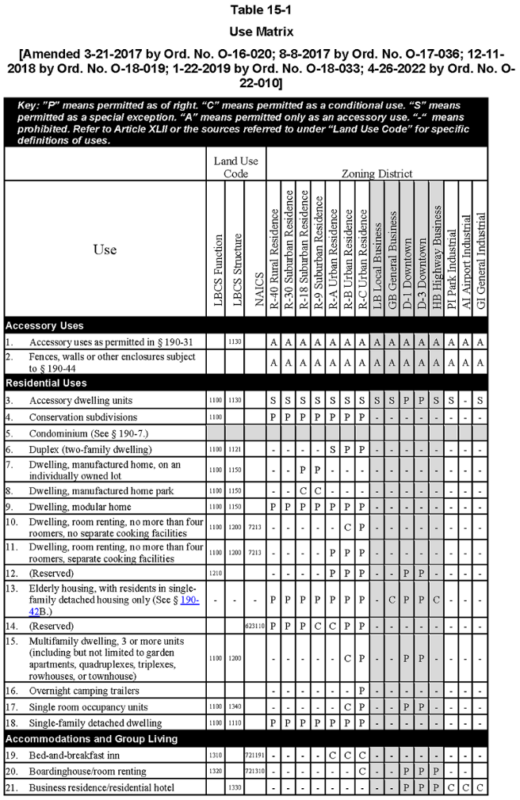Figure 1 shows a portion of a table of uses from Nashua, New Hampshire’s zoning ordinance. Like the vast majority of other zoning ordinances in the US, the Nashua ordinance considers a use prohibited unless it is expressly permitted. Some uses are only permitted if they are “accessory” to specific other uses, that is, they are not the main use of the land. Some uses are neither permitted nor prohibited outright, but require a special permit from a land-use board. These special permits are typically offered on a partially discretionary basis, such that a landowner has to prove that the new use will meet pre-established criteria.