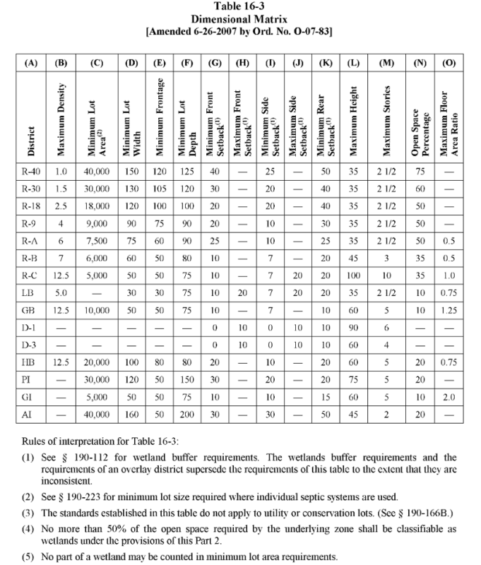 In larger towns that have the assistance of professional staff in drawing up regulations, ordinances will typically have a table of uses and a table of dimensional regulations. The table of uses will tell you what uses are allowed or prohibited in each district, and the table of dimensional regulations will tell you the minimum and maximum requirements for lots and buildings.