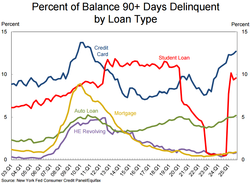 The Federal Reserve’s Quarterly Report on Household Debt and Credit has just been released, and it’s not a pretty picture. Alongside debt on student loans spiking, seriously delinquent (90+ days late) credit cards have reached levels not seen since the financial crisis. About one in eight credit card accounts is now three months behind. This trend has been rising since 2022, and seems to indicate that households were already beginning to fall behind on their debts, setting the stage for serious delinquencies.